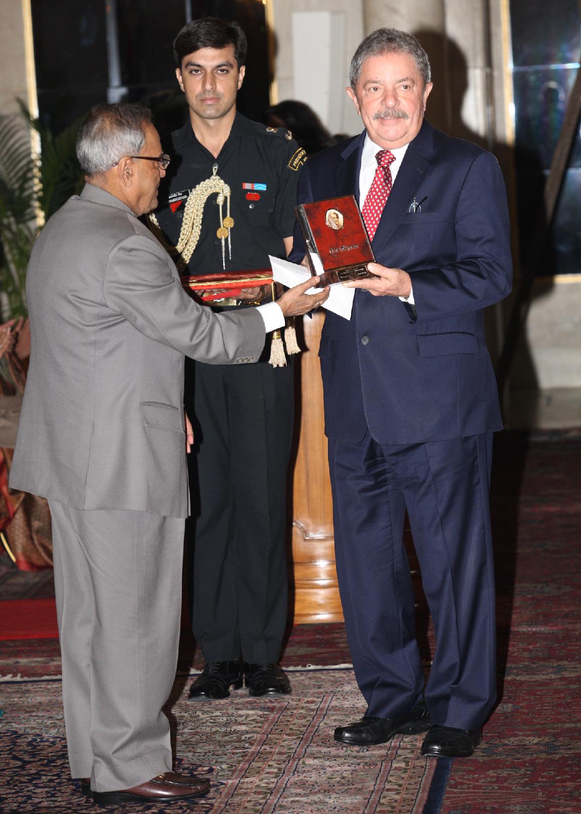The President of India, Shri Pranab Mukherjee Presenting the Indira Gandhi Prize for Peace, Disarmament and Development to the former President of the Federative Republic of Brazil, H.E. Mr. Luiz Inacio Lula da Silva at Rashtrapati Bhavan in Delhi on Nov 22, 2012