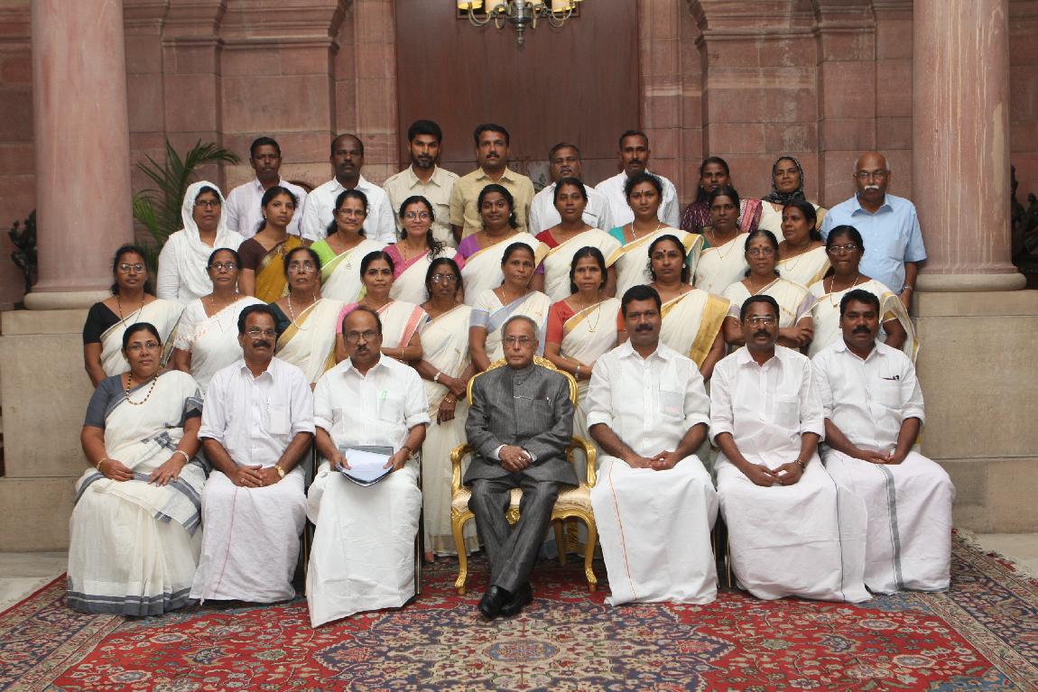 The President of India, Shri Pranab Mukherjee With Prof KV Thomas, Minister of State (I/C) For Consumer Affairs, Food & Public Distribution Shri Tonny Chammany , Mayor Shri R Thyagarajan, Standing Committee Chairman and 31 councilors from The Corporation of Cochin (Total 34 Persons) on October 19, 2012