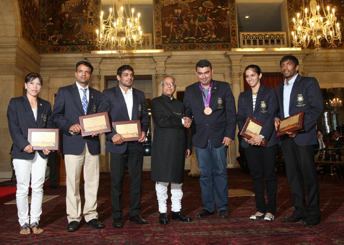 The President of India, Shri Pranab Mukherjee Hosted Reception to Indian Olympic Team and Felicitated to medal winners in last Olympic in London at Rashtrapati Bhavan in Delhi on Aug 18, 2012