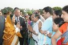 The President of India, Smt Pratibha Devisingh Patil being welcomed by Governor of West Bengal, Shri Gopalkrishna Gandhi and the Chief Minister of West Bengal, Shri Buddhadeb Bhattacharjee at Dum-Dum Airport of Kolkata in West Bengal on Aug 23, 2008