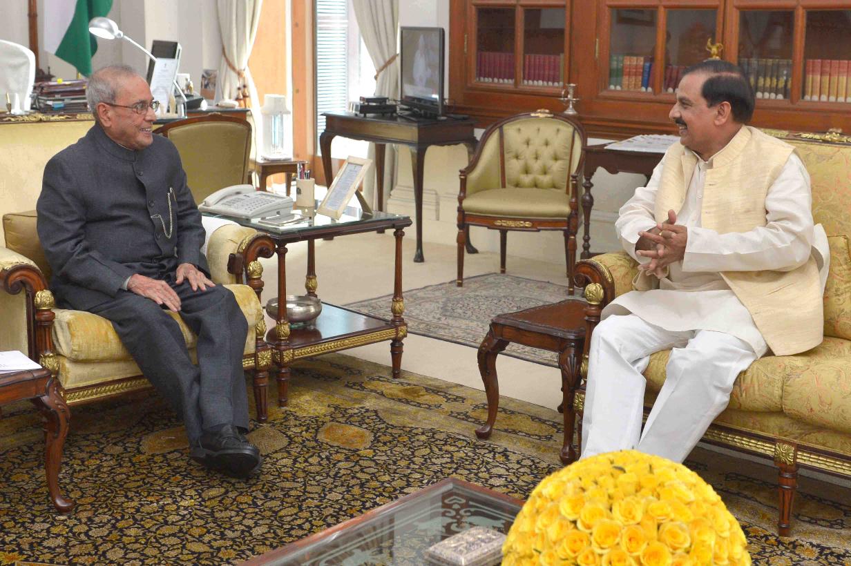 The President of India, Shri Pranab Mukherjee meeting with Dr. Mahesh sharma, Minister of State (IC) for Culture and Tourism, at Rashtrapati Bhavan on July 20, 2017.