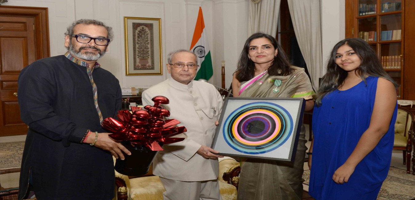 The President of India, Shri Pranab Mukherjee meeting with Shri Subodh Gupta and Smt. Bharti Kher, participants of In-Residence Programme for Artists, at Rashtrapati Bhavan on March 09, 2017.