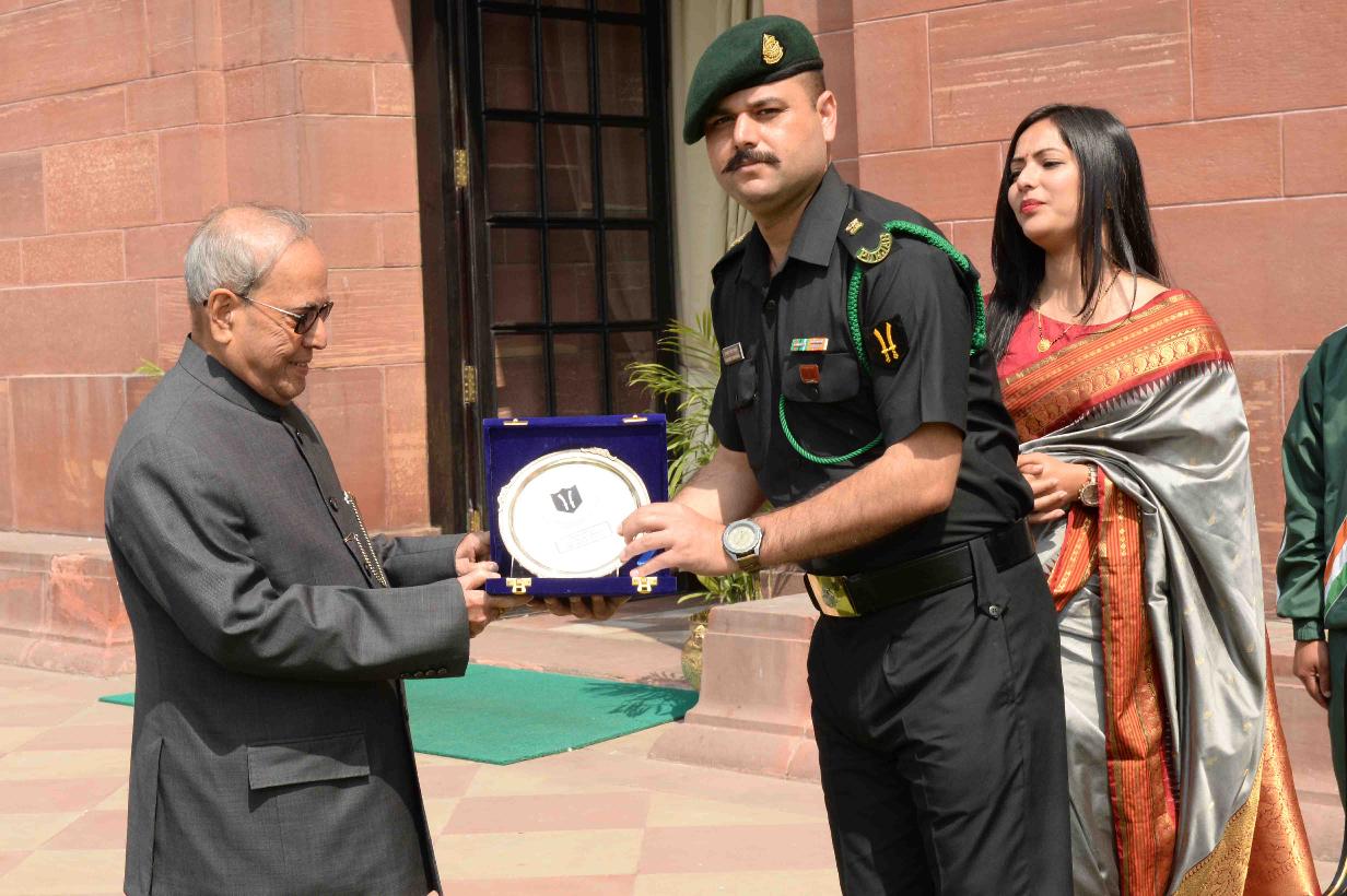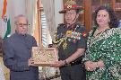 The President of India, Shri Pranab Mukherjee meeting with Lt. Gen. Rakesh Sharma, Adjutant General and Hony ADC to the President alongwith his wife Smt. Payal Sharma and daughter Ms. Rhea Sharma, at Rashtrapati Bhavan on March 14, 2017.