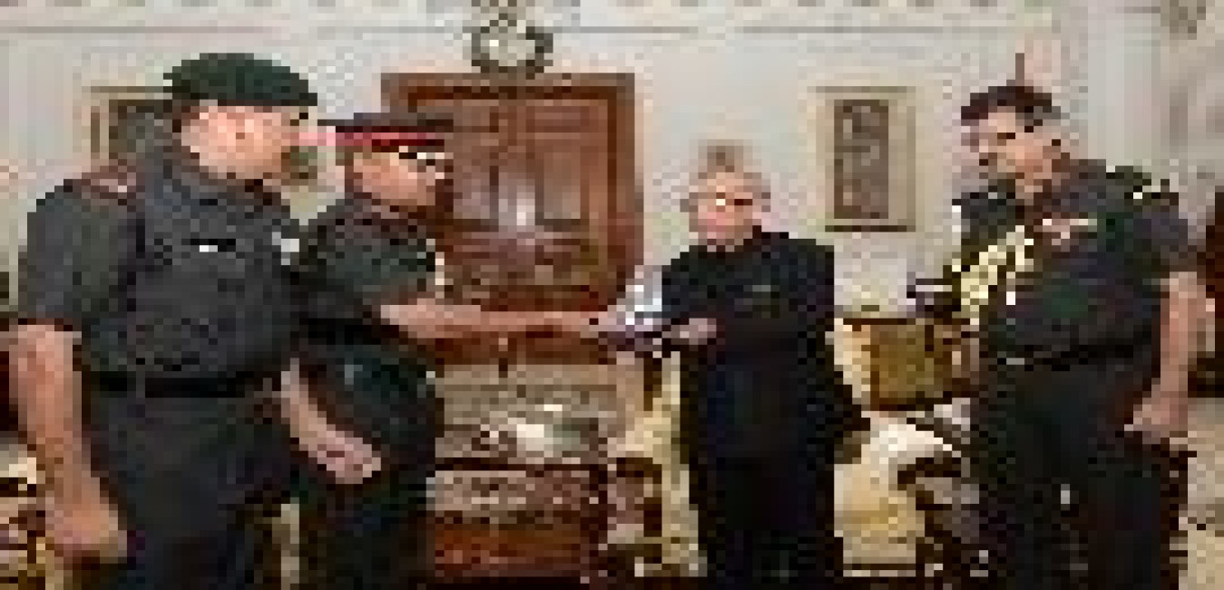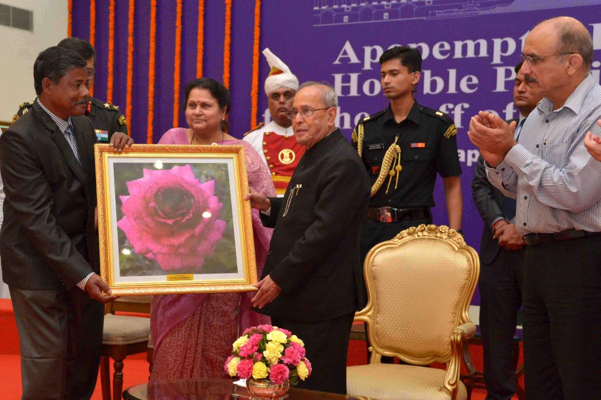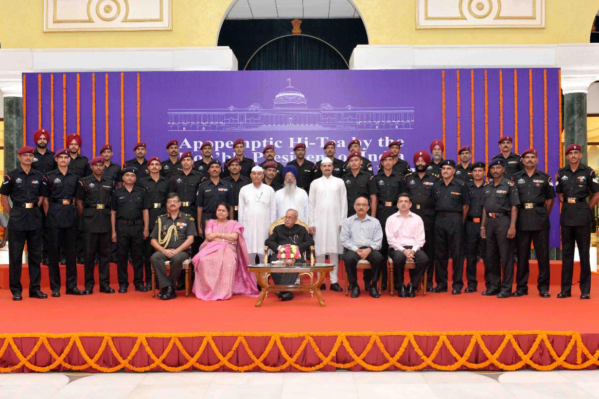 The President of India, Shri Pranab Mukherjee presenting the plaque of Appreciation to Col. Anil Jhinjheria, Commanding Officer alongwith Sub. Maj. Sikandar Lal, 8 JAK LI (Siachen), at Rashtrapati Bhavan on July 18, 2017.
