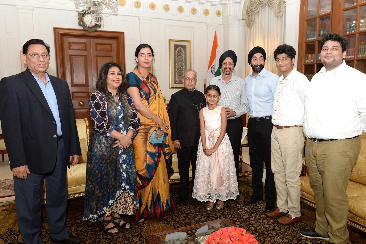 The President of India, Shri Pranab Mukherjee meeting with Shri Kapish Mehra with others, at Rashtrapati Bhavan on July 18, 2017.