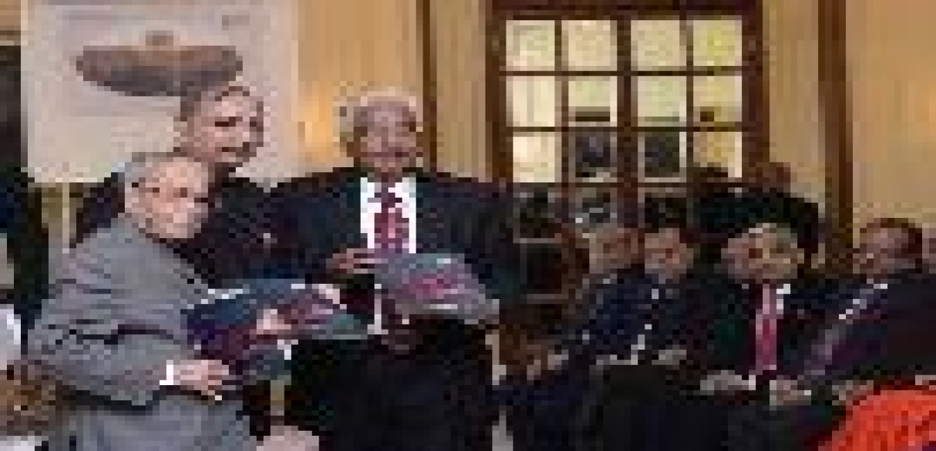 The President of India, Shri Pranab Mukherjee presenting the Lifetime Achievement Award to Dr. Rajendra Prasad, Principal of the Ramjas College for last 32 years, at the Centenary Celebrations of Ramjas College, at Rashtrapati Bhavan on February 13, 2017.