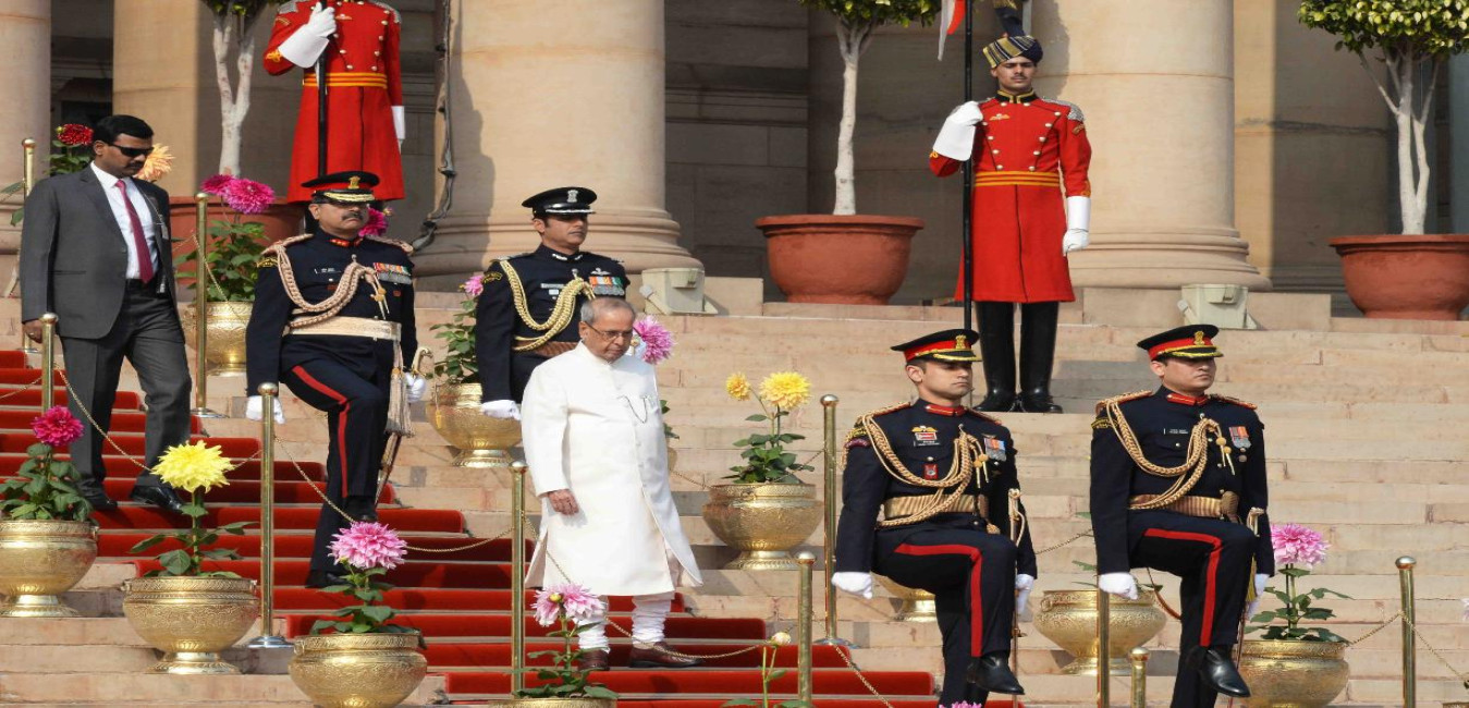 The President of India, Shri Pranab Mukherjee taking the Salute from President's Body Guard (PBG) at the Forecourt of Rashtrapati Bhavan during the departure for witnessing the 'Beating Retreat' at Vijay Chowk in New Delhi on January 29, 2017.