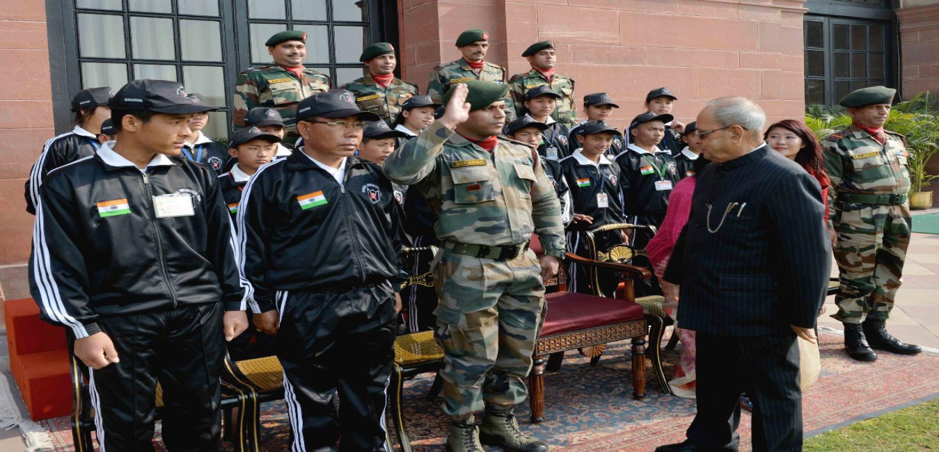 The President of India, Shri Pranab Mukherjee with the children from Imphal attending National Integration Tour, organised by 9 Sector, Assam Rifles, at Rashtrapati Bhavan on January 14, 2017.