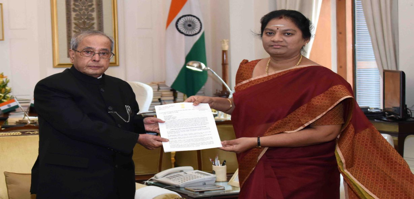 The President of India, Shri Pranab Mukherjee meeting with Smt. Sasikala Pushpa, MP (RS) alongwith her husband Shri Lingesvara Thilagan, at Rashtrapati Bhavan on December 20, 2016.