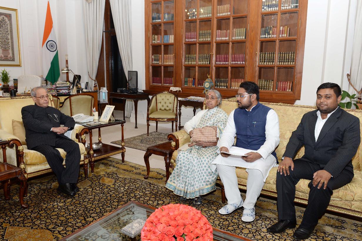 The President of India, Shri Pranab Mukherjee meeting with Smt. & Shri Uday Sankar Majumdar, General Manager, Syndicate Bank alongwith their daughter, at Rashtrapati Bhavan on December 19, 2016.