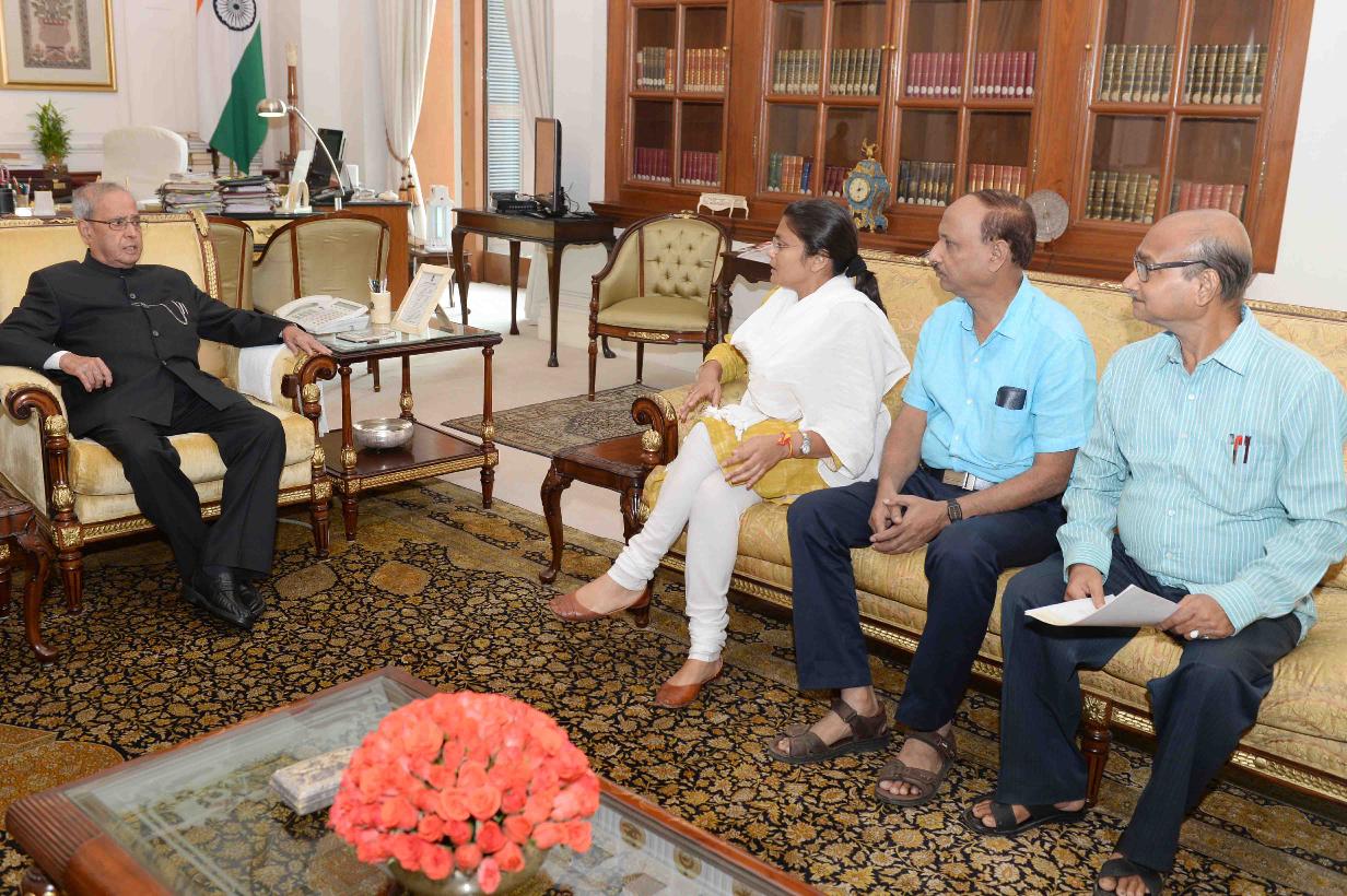 The President of India, Shri Pranab Mukherjee meeting with Shri Ratan Kumar Nandi, Secretary alongwith the members of Monetary Committee of Bangiya Sahitya Parishad, Kolkata, at Rashtrapati Bhavan on October 26, 2016.