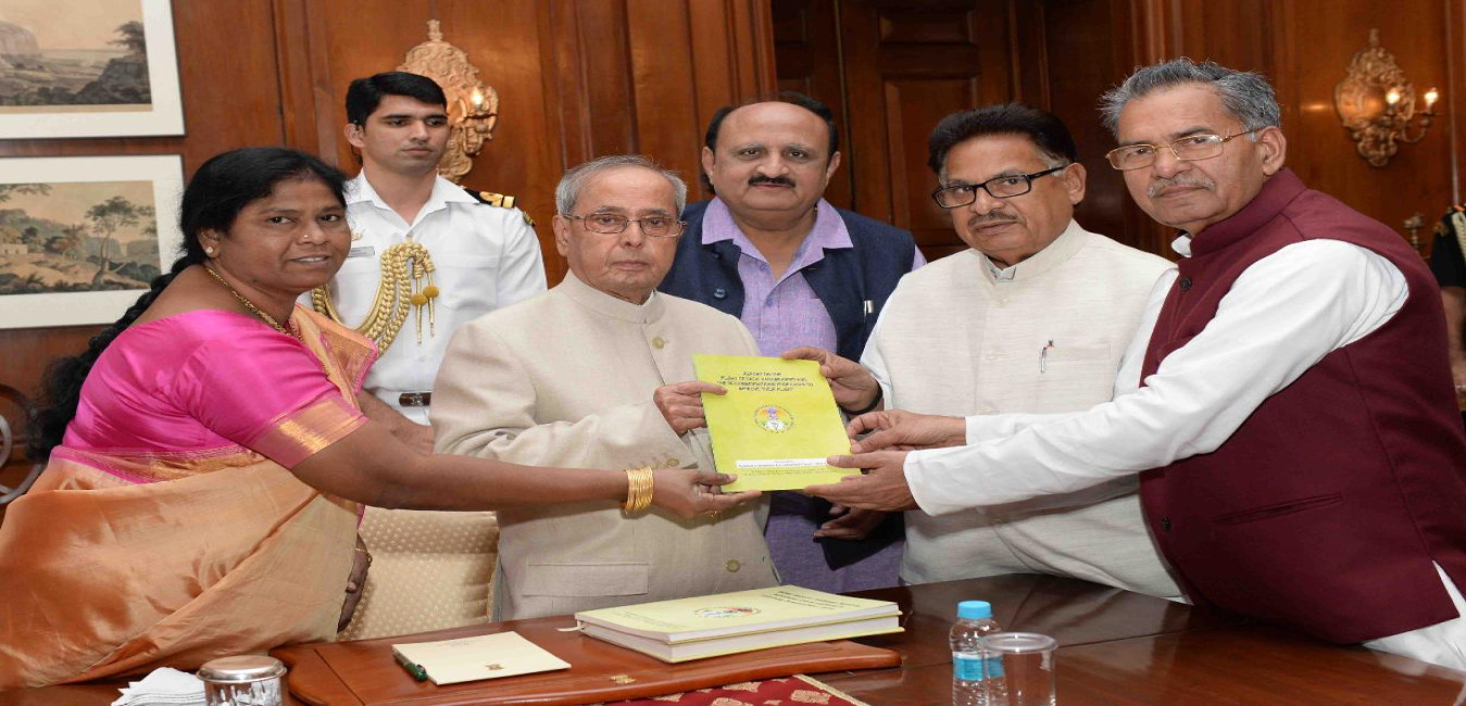 The President of India, Shri Pranab Mukherjee being presented the Annual Report for the period 2016-17 alongwith Special Report on problems faced by Scheduled Castes students in obtaining scholarships-2016 of the National Commission for Scheduled Castes by Dr. P.L. Punia, Chairman alongwith Vice Chairman, Members and officers of the National Commission for Scheduled Castes, at Rashtrapati Bhavan on October 17, 2016.