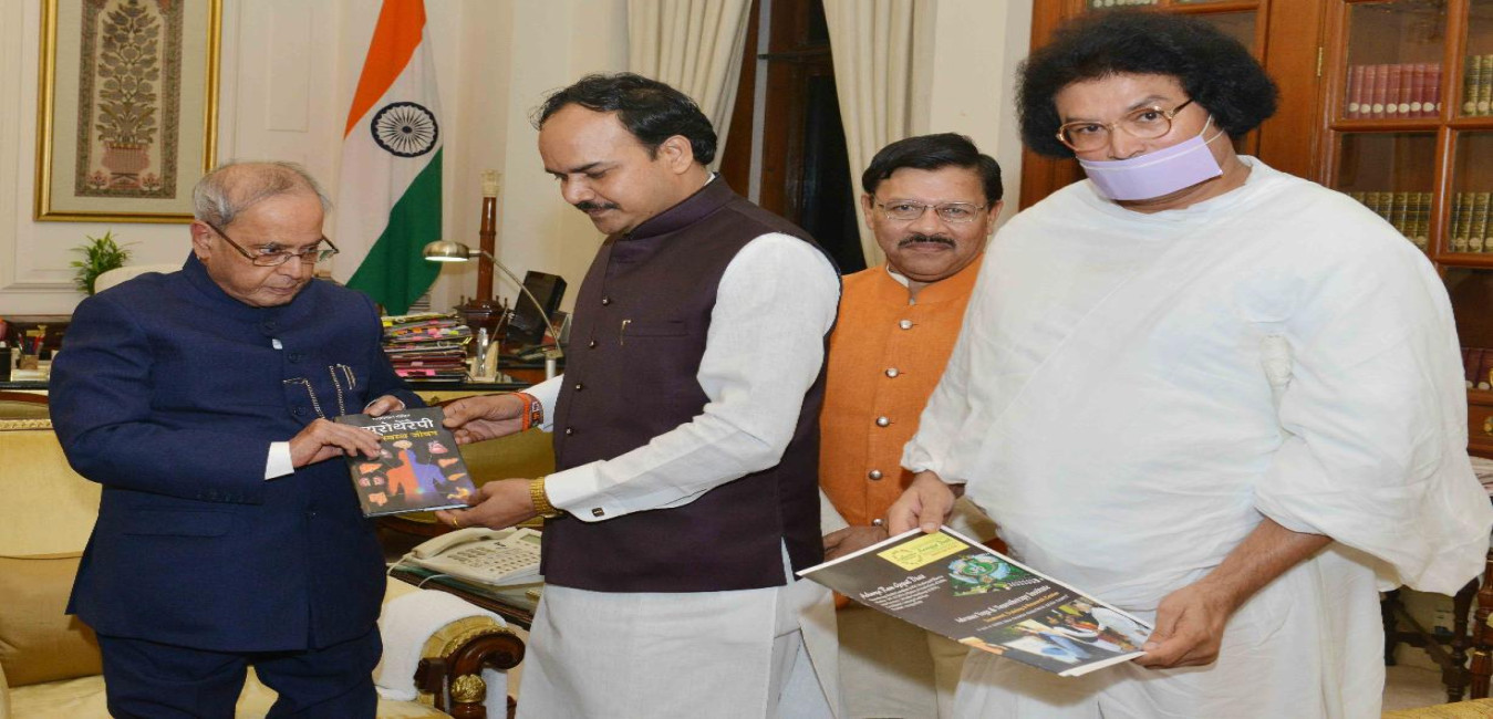 The President of India, Shri Pranab Mukherjee receiving a book ''Neurotherapy Dwara Swastha Jeevan'' from Acharya Ramgopal Dixit, Founder President, Aarogyapeeth with others, at Rashtrapati Bhavan on October 20, 2016.