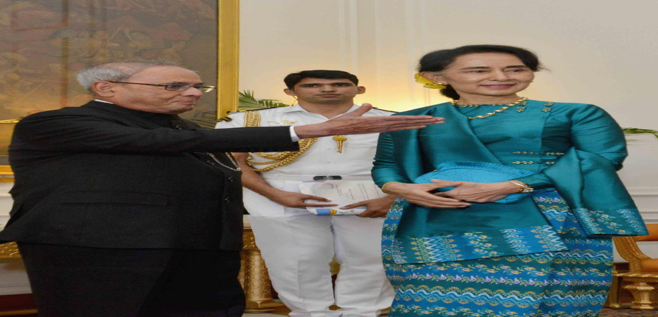 The State Counsellor of the Republic of Union Myanmar, H.E. Daw Aung San Suu Kyi calling on the President of India, Shri Pranab Mukherjee, at Rashtrapati Bhavan on October 18, 2016.
