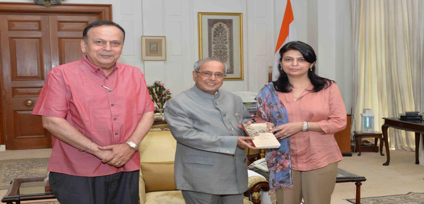 The President of India, Shri Pranab Mukherjee meeting with Shri Pankaj Vora alongwith his wife Smt. Renee Ranchan, at Rashtrapati Bhavan on July 06, 2017.