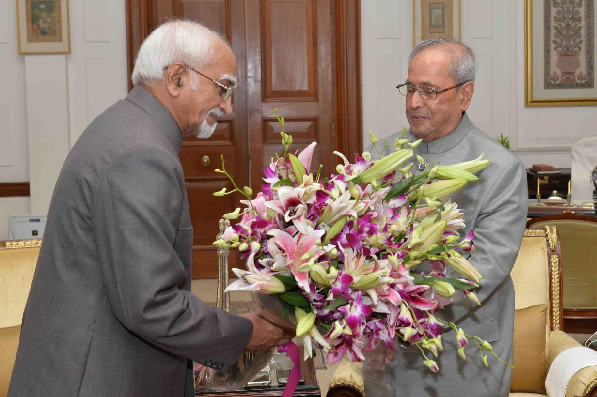 The President of India, Shri Pranab Mukherjee meeting with Shri Mohd. Hamid Ansari, Vice President of India, at Rashtrapati Bhavan on July 06, 2017.