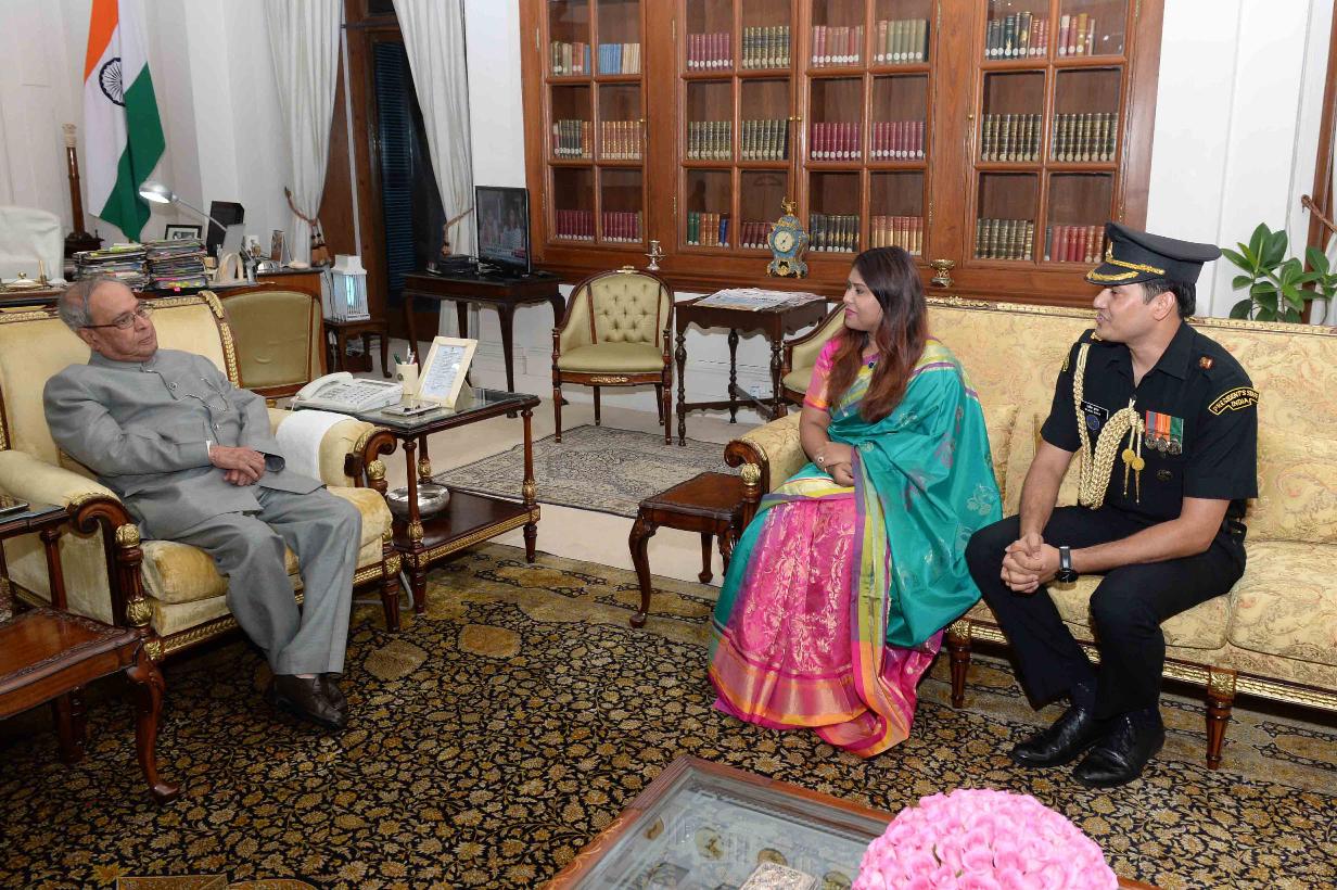 The President of India, Shri Pranab Mukherjee meeting with Major Rajesh Kumar, ADC to the President alongwith his wife Dr. Vandana Yadav, during a farewell call, at Rashtrapati Bhavan on July 06, 2017.
