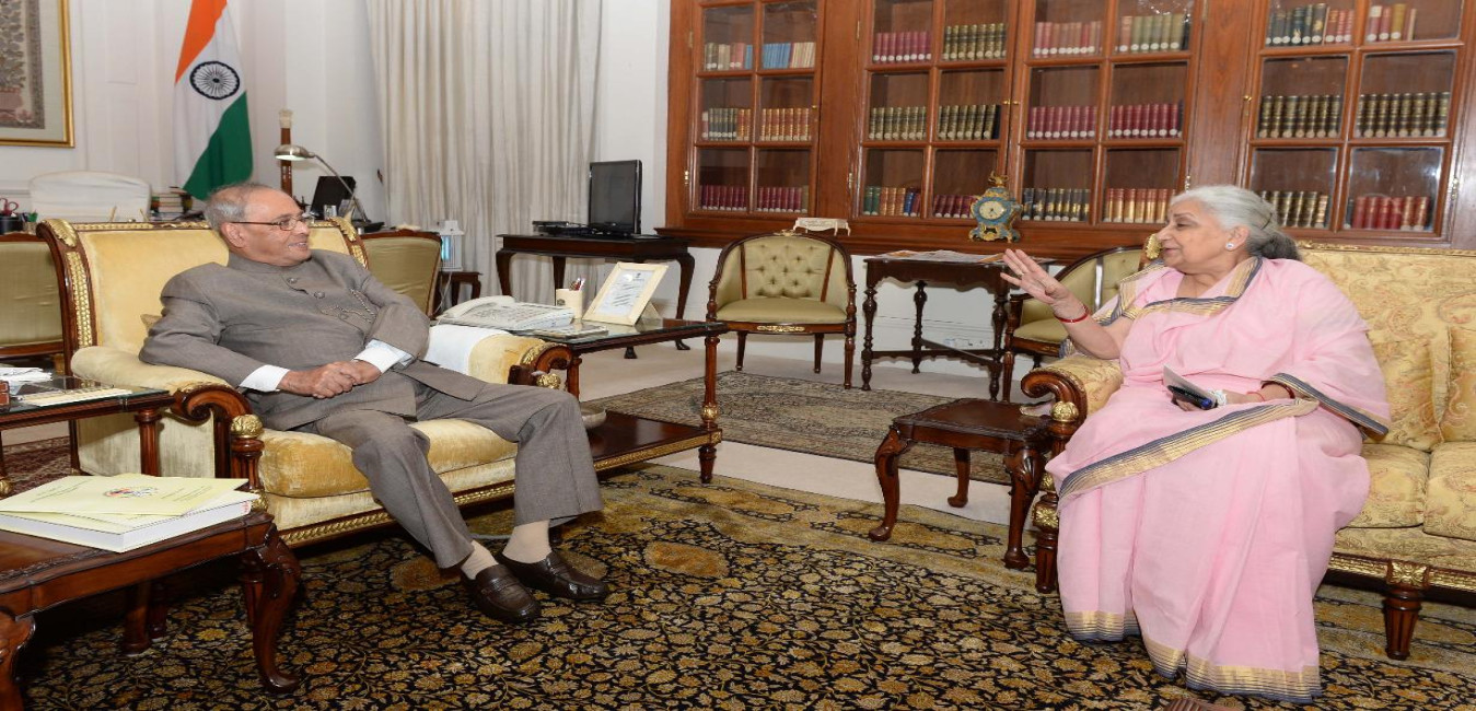 The President of India, Shri Pranab Mukherjee meeting with Smt. Sheila Dikshit, former Chief Minister of Delhi & former Governor of Kerala, at Rashtrapati Bhavan on August 17, 2016.