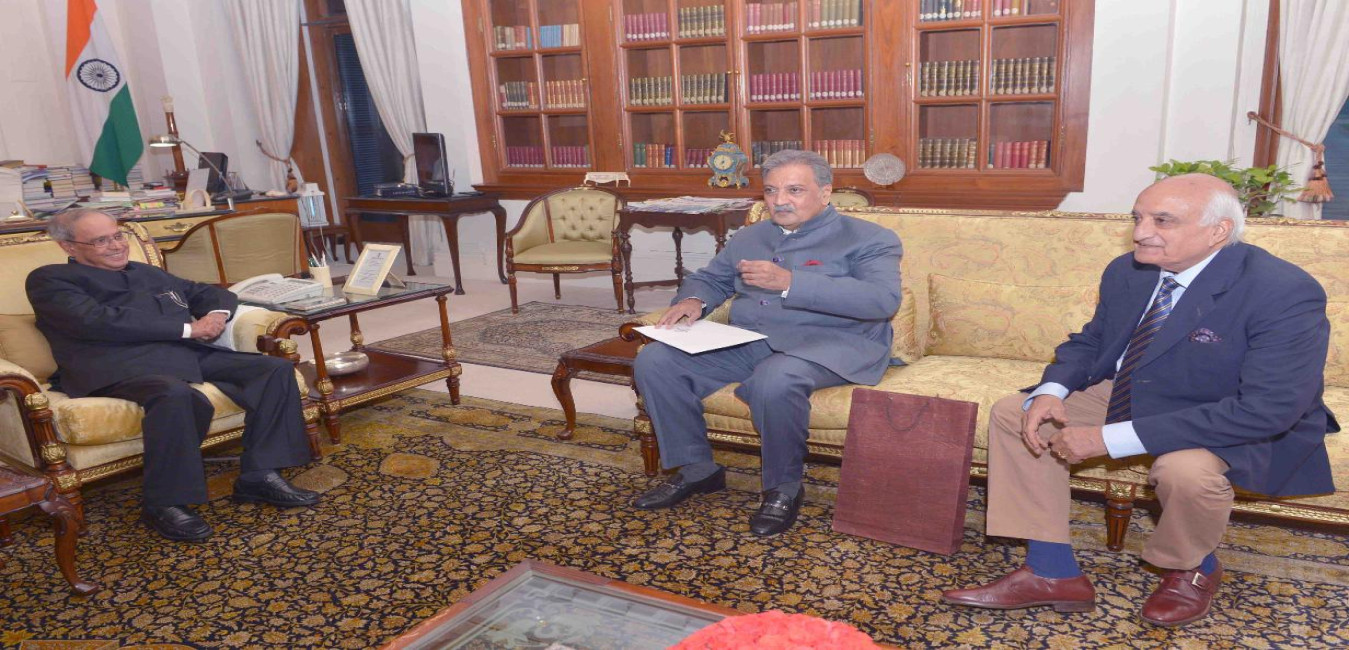 The President of India, Shri Pranab Mukherjee meeting with Shri Ashok Singh, National Vice President, INTUC & Member, Kendriya Hindi Samiti alongwith Nawab Jamin Sahib, Chairman, Indo-Iran Persian Cultural Board, Faizabad, at Rashtrapati Bhavan on August 10, 2016.