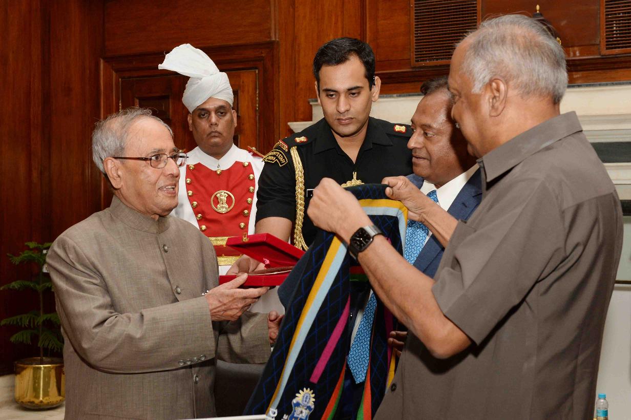 The President of India, Shri Pranab Mukherjee meeting with Pandit Devabrata (Debu) Chaudhuri, at Rashtrapati Bhavan on July 21, 2016.