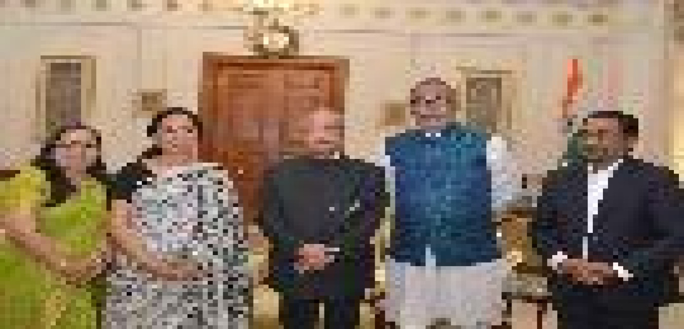 The President of India, Shri Pranab Mukherjee meeting with Ustad Amjad Ali Khan alongwith his wife Smt. Subhalakshmi Khan and Shri Mohan Jacob, at Rashtrapati Bhavan on June 28, 2016.