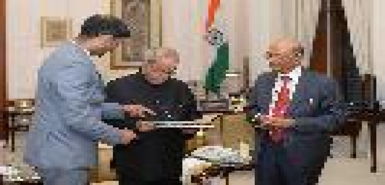 The President of India, Shri Pranab Mukherjee receiving the books ''Martyr and Freedom Fighter'' and ''Biography of Swami Kuvalyananda'' from Shri P.H. Parekh alongwith Shri Subodh Tiwari, Secretary, Kivalyadhama Shriman Madhava Yoga Mandir Samiti Lonavala, at Rashtrapati Bhavan on June 30, 2016.