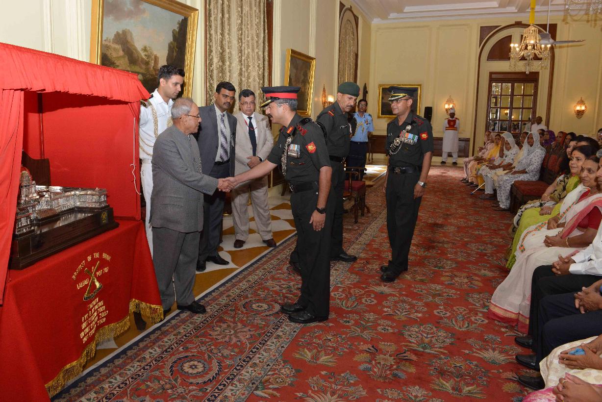 The President of India, Shri Pranab Mukherjee unveiling the Trophy of 30th Year of Siachen Operation, during the meeting with Veer Naris (War Widows) attending Pilgrimage Tour organised by the 8th JAK LI (SIACHEN), at Rashtrapati Bhavan on June 26, 2016 .