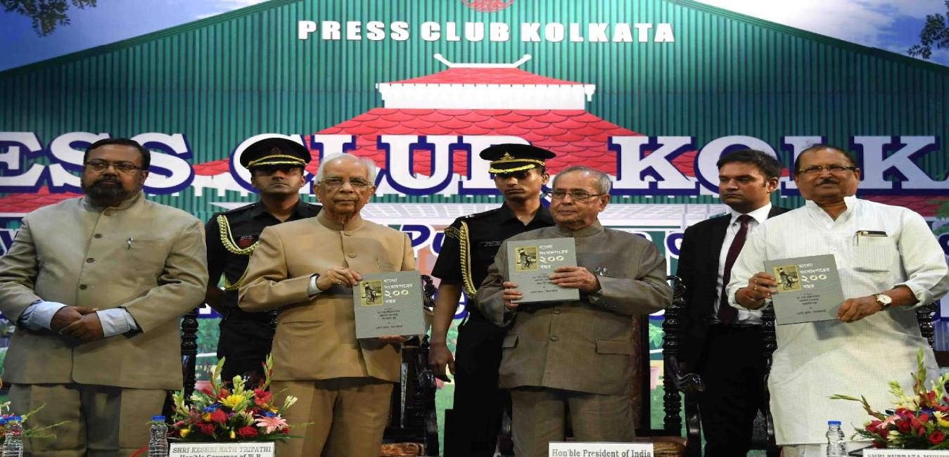 The Governor of West Bengal, Shri Keshari Nath Tripathi releasing the commemorative volume book of the Bicentenary of Publication of News Papers in Bengali and presenting first copy to the President of India, Shri Pranab Mukherjee at the Bicentenary Celebrations of Bengali Newspaper, organized by the Press Club, Kolkata, at Kolkata, in West Bengal on June 30, 2017.
