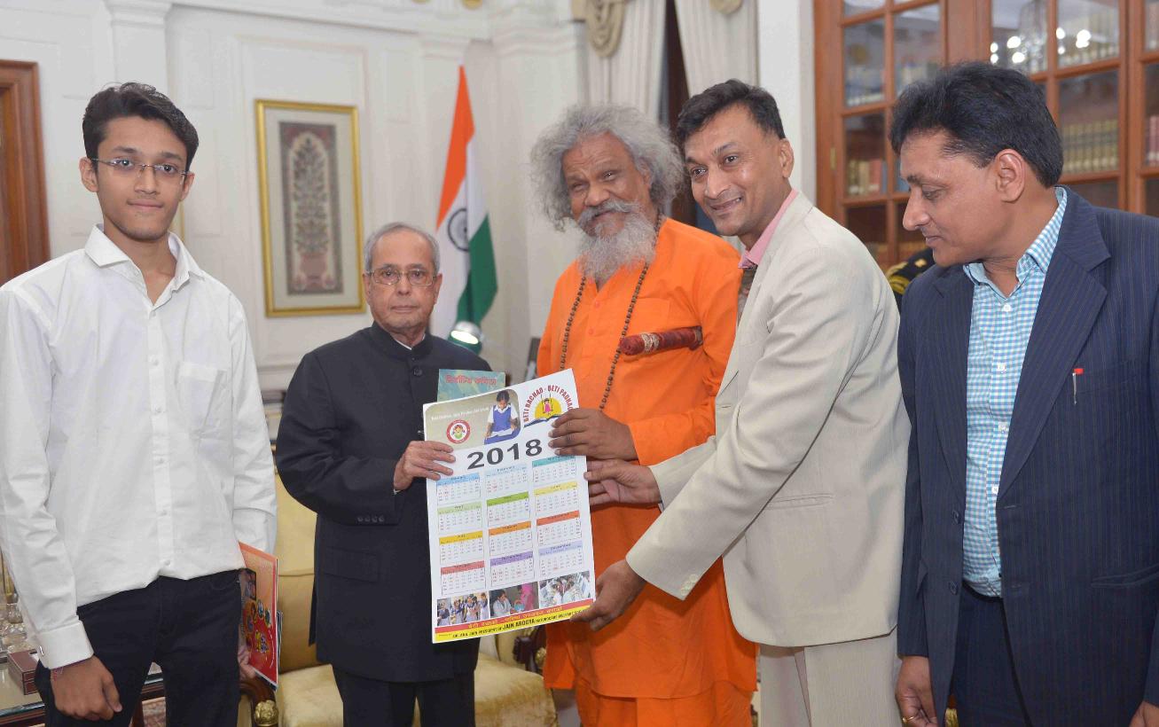 The President of India, Shri Pranab Mukherjee receiving a special calendar designed for Beti Bachao Beti Padhao from Dr. Prasanna Kumar Patasani, MP (LS) alongwith Dr. Anil Jain from Jain Arogya Naturocare Welfare Society and Par Anand Charitable Trust, at Rashtrapati Bhavan on June 28, 2017.