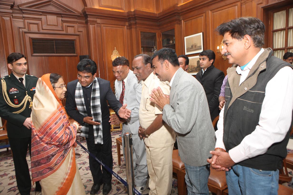 The President of India, Smt Pratibha Devisingh Patil interacting with Shri Bharatsingh Hada and others from Ujjain at Rashtrapati Bhavan in New Delhi on Feb 17, 2012