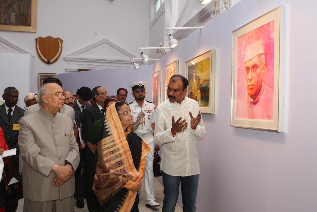 The President of India, Smt Pratibha Devisingh Patil going around an Exhibition of Paintings of Mahatma Gandhi and Jawaharlal Nehru at Raj Bhavan of Karnataka in Bangalore on Aug 07, 2011