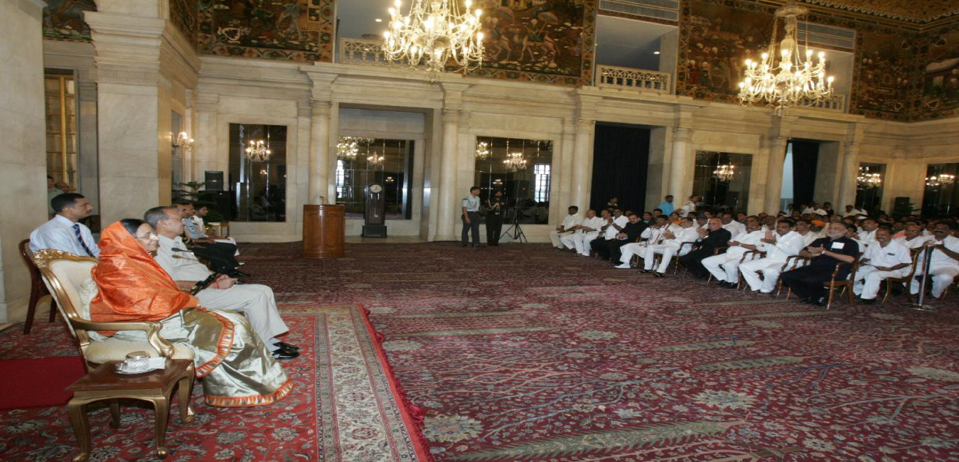 The President of India, Smt Pratibha Devisingh Patil interacting with the State President, Shri Dilip Singh Hazari alongwith the Members of the Maharashtra Rajput Kshritya Sangh, Nanded, Maharashtra at Ashok Hall of Rashtrapati Bhavan in New Delhi on Aug 03, 2007