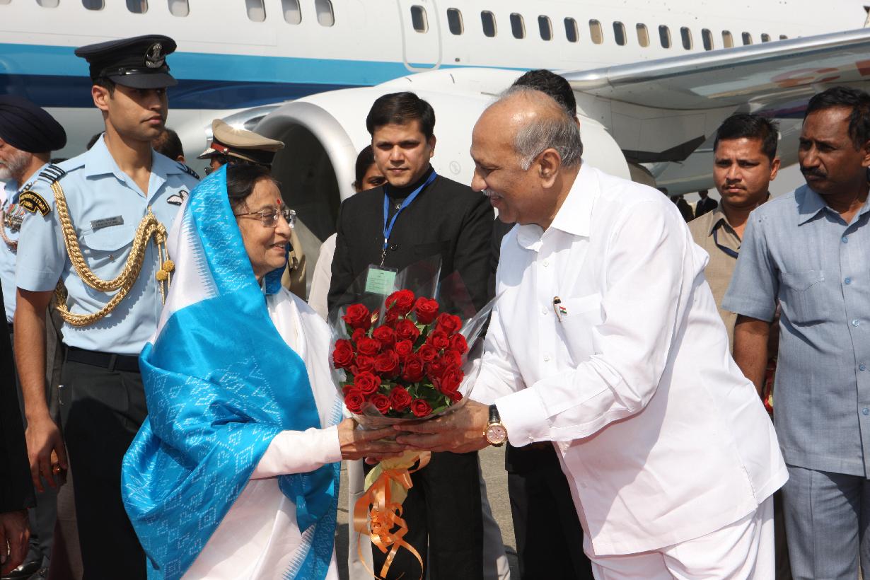The President of India, Smt Pratibha Devisingh Patil being welcomed by the Governor of Maharashtra, Shri K Sankaranarayanan at Jalgaon Airport in Maharashtra on March 23, 2012