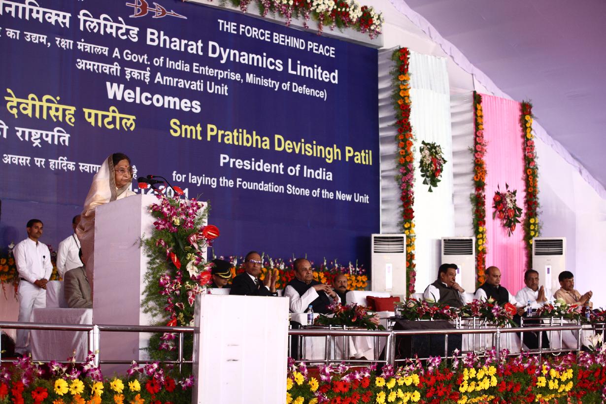 The President of India, Smt Pratibha Devisingh Patil at the function to lay the Foundation Stone of the New Plant of their New Factory and also viewing an Exhibition of Bharat Dynamics Limited at Nandgaon Peth in Maharashtra on Dec 11, 2011