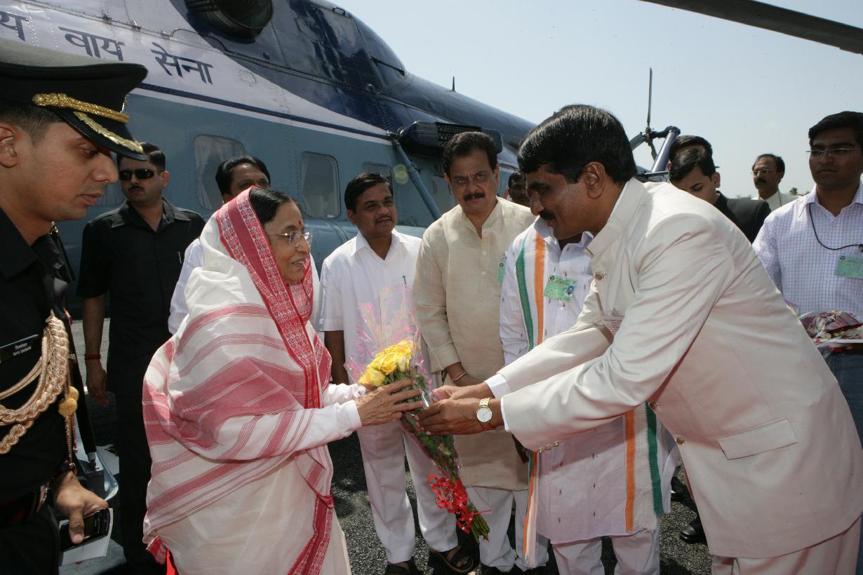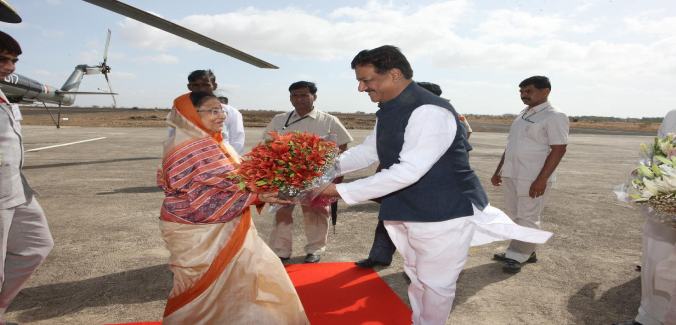 The President of India, Smt Pratibha Devisingh Patil being welcomed by the Chief Minister of Maharashtra, Shri Prithviraj Chavan at Nandurbar Helipad in Maharashtra on Feb 24, 2012