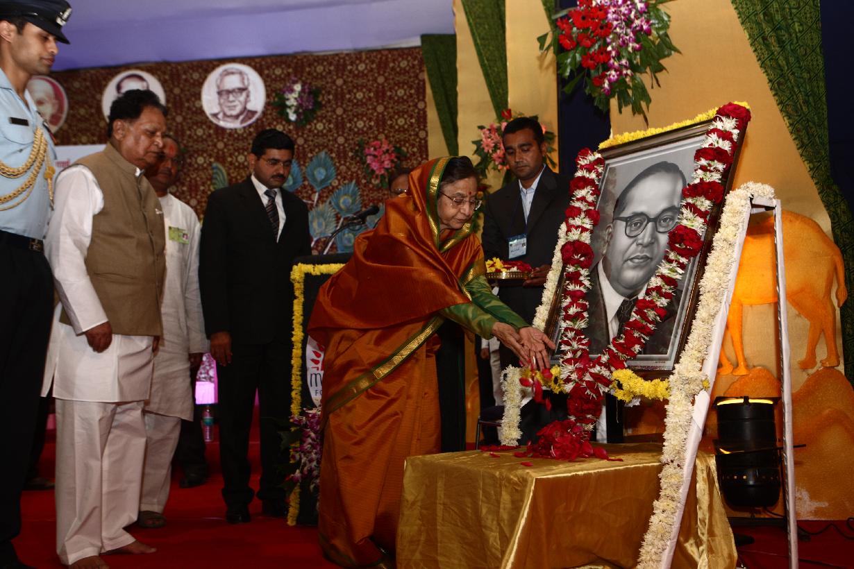 The President of India, Smt Pratibha Devisingh Patil presenting the Babasaheb Ambedkar Award instituted by the Marwadi Foundation to Shri R S Gavai at Amravati in Maharashtra on Dec 12, 2011