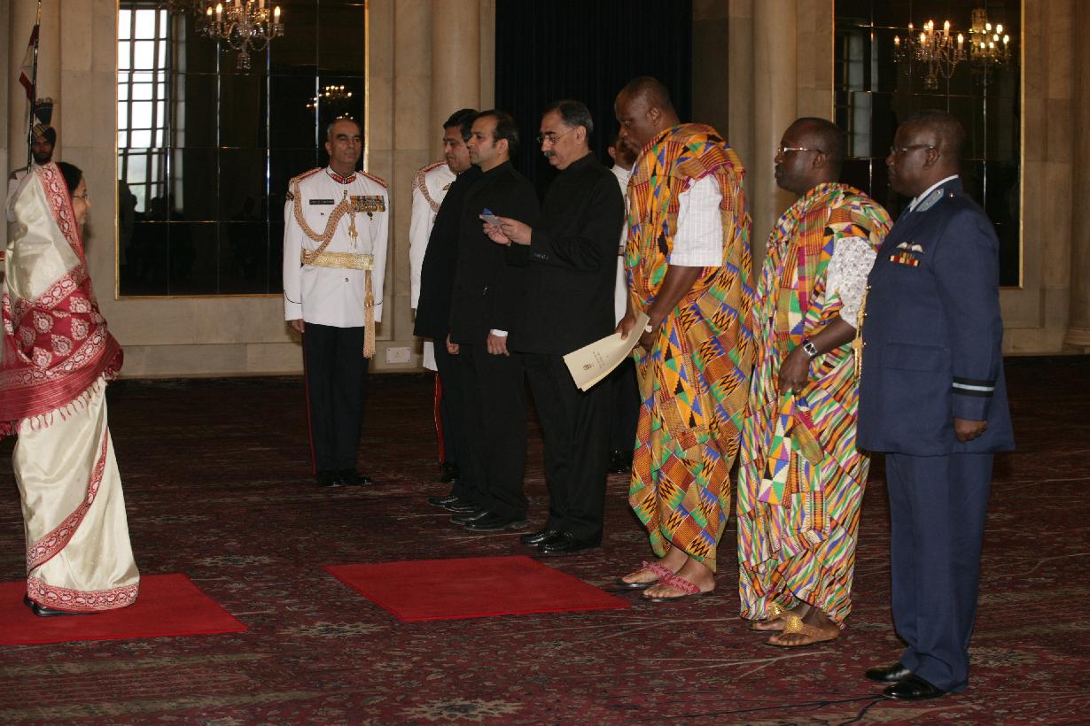 The High Commissioner Designate of Ghana, HE Mr Robert Tachle Menson presenting his credentials to the President of India, Smt Pratibha Devisingh Patil at Rashtrapati Bhavan in New Delhi on Nov 20, 2009