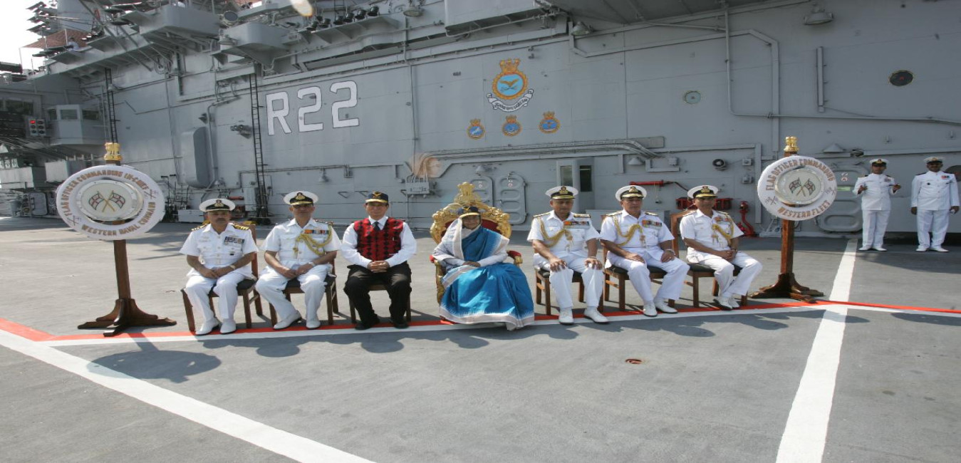 The President of India, Smt Pratibha Devisingh Patil taking the Salute onboard the INS Viraat to which She Paid a visit at Mumbai in Maharashtra on Dec 23, 2009