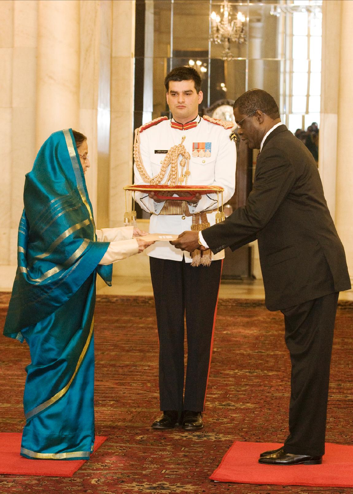 The Ambassador of Cote D'Ivoire, His Excellency Mr Sainy Tiemele presenting his Credentials to the President of India, Smt Pratibha Devisingh Patil at Rashtrapati Bhavan in New Delhi on Nov 01, 2011