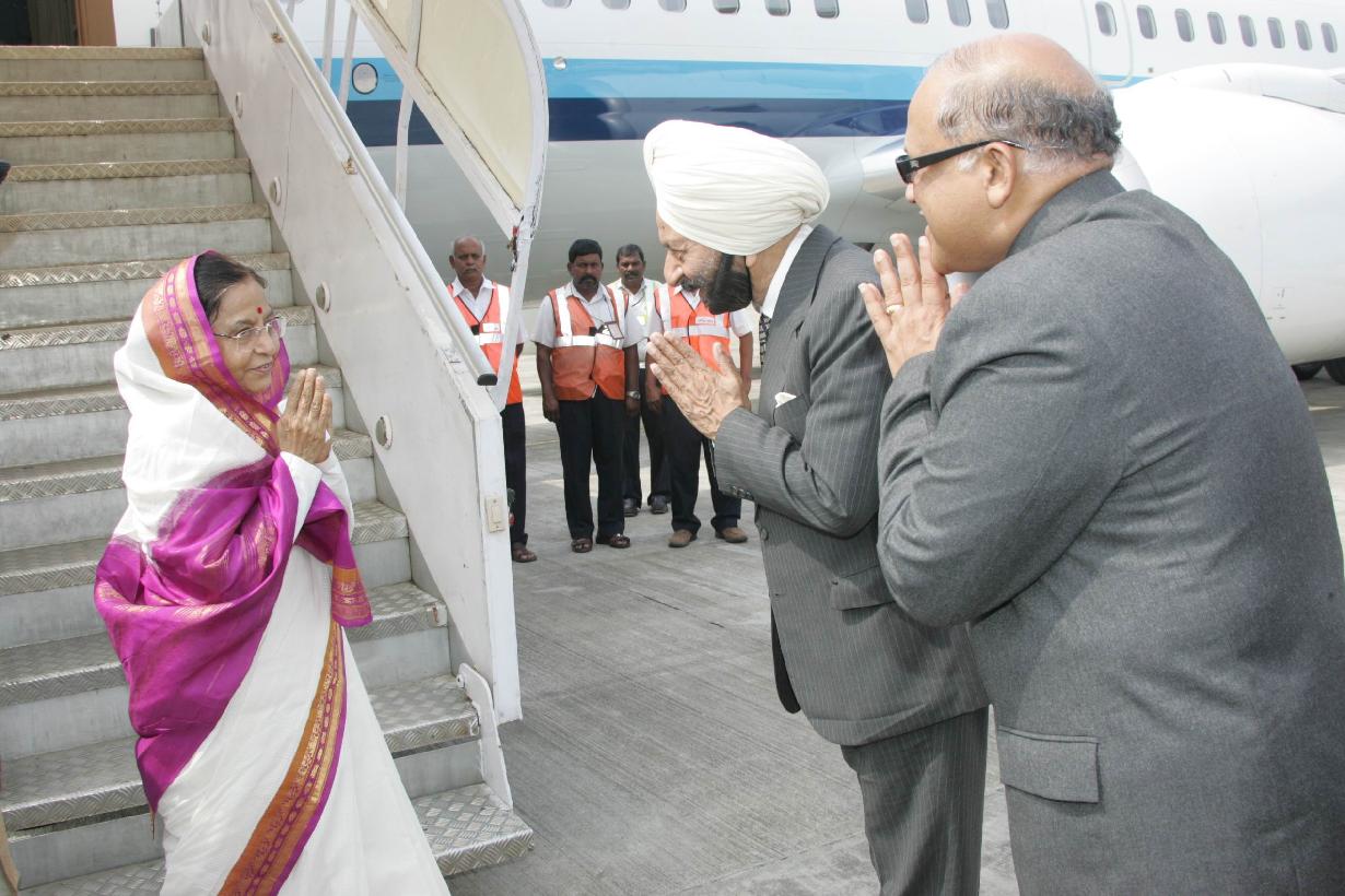 The President of India, Smt Pratibha Devisingh Patil being welcomed by the Governor of Goa, Shri Shivinder Singh Sidhu and Chief Minister of Goa, Shri Digambar Kamat at Goa Airport in Goa on Jan 03, 2011
