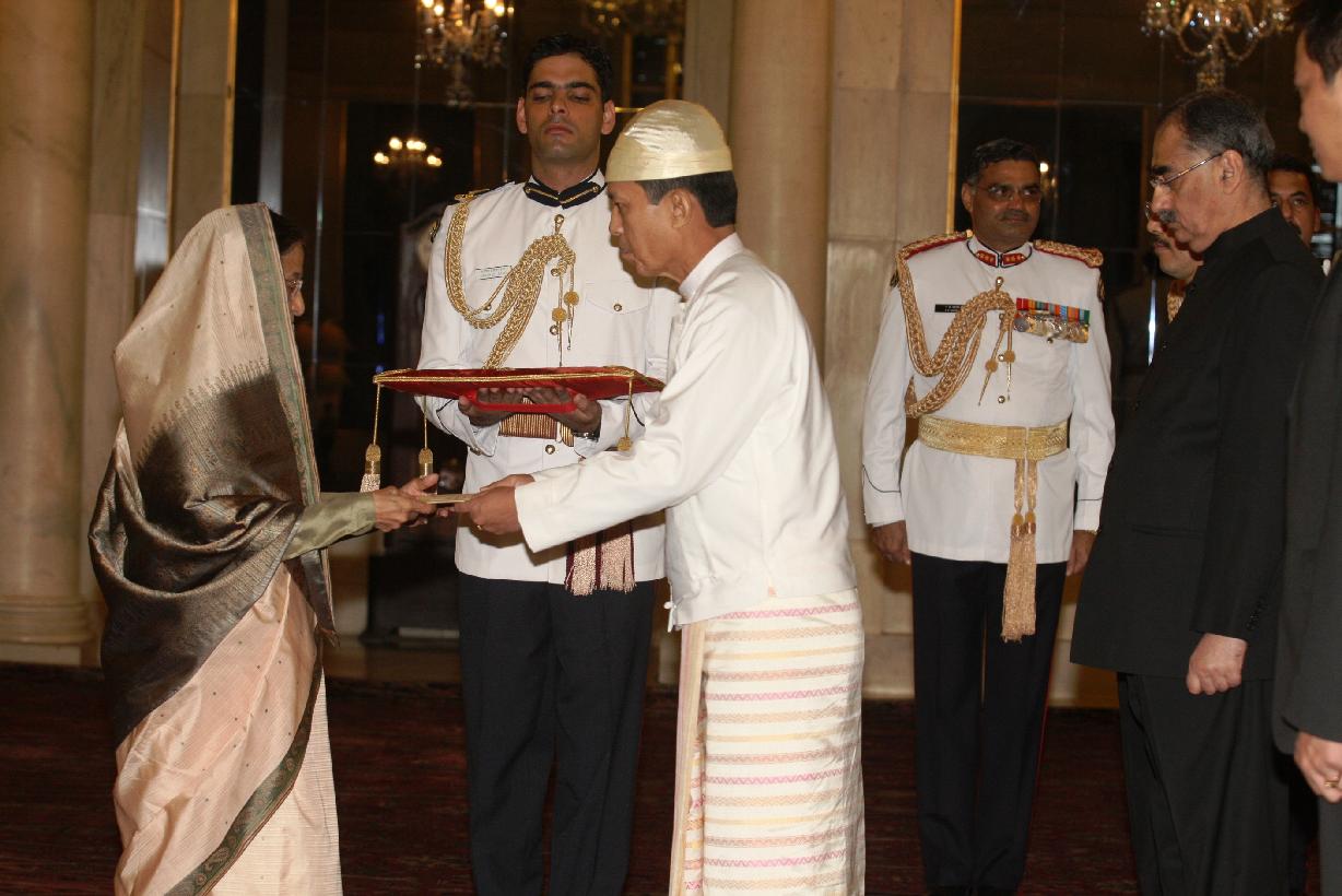 The Ambassador Designate of Myanmar, HE Mr U Zin Yaw presenting his credentials to the President of India, Smt Pratibha Devisingh Patil at Rashtrapati Bhavan in New Delhi on Aug 12, 2011