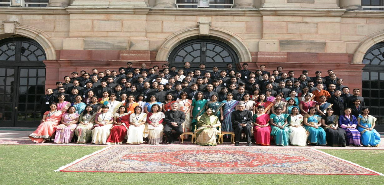 The President of India, Smt Pratibha Devisingh Patil interacting with the Trainee Officers of the Indian Administrative Service (IAS) 2010 Batch and Officers of the Bhutan Administrative Service at Rashtrapati Bhavan in New Delhi on Feb 12, 2011