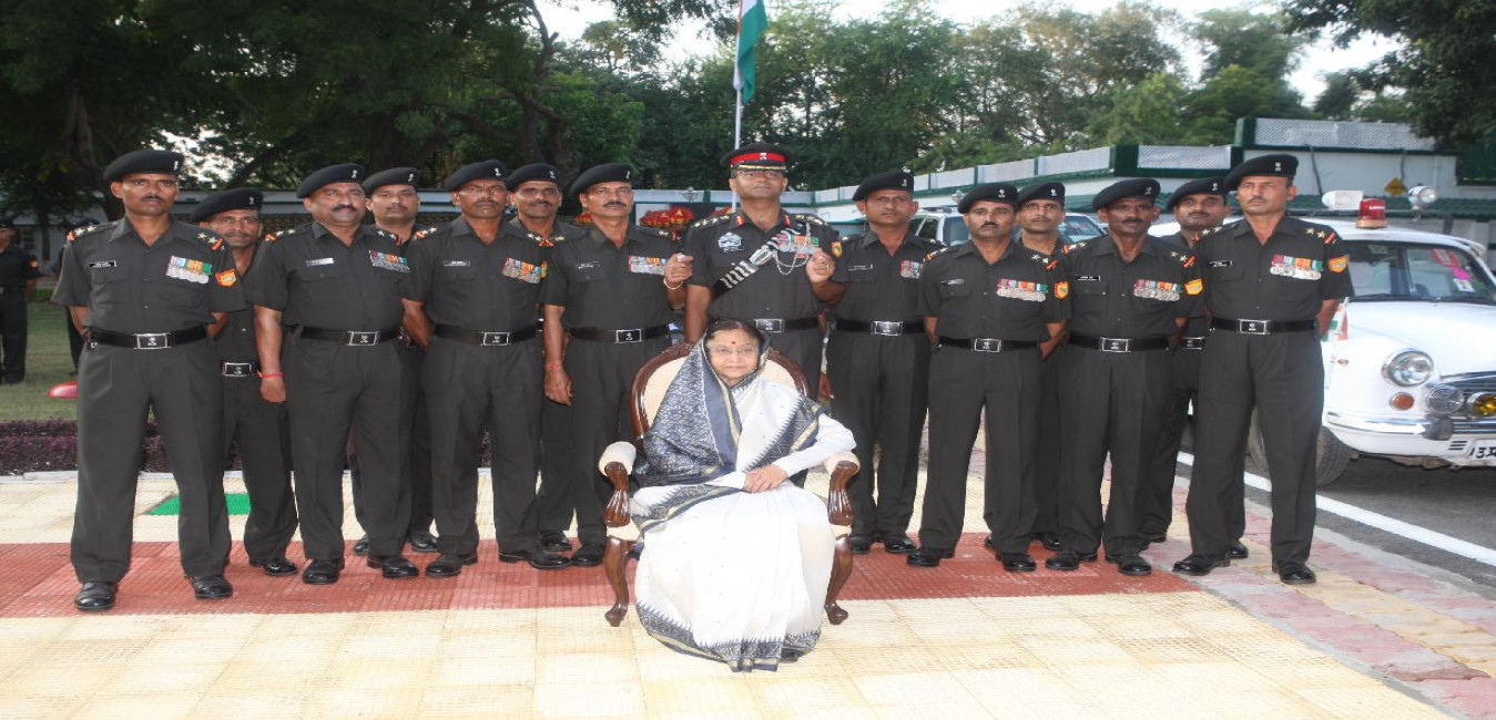 The President of India, Smt Pratibha Devisingh Patil posing for a Group Photographs with 27 Armored Brigade at Guest Room of Babina in Uttar Pradesh on Oct 19, 2010
