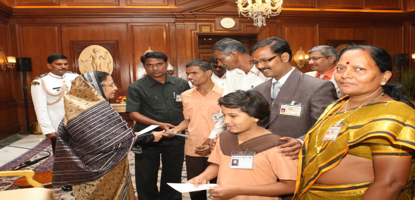The President of India, Smt Pratibha Devisingh Patil interacting with the Students from Dr Narendra Bhiwapurkar Andh Vidyalaya from Amravati at Rashtrapati Bhavan in New Delhi on Sep 29, 2010
