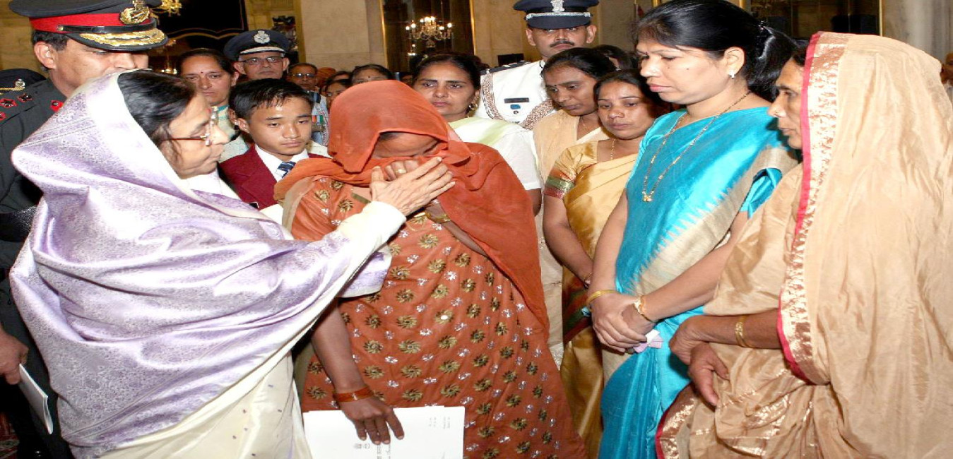 The President of India, Smt Pratibha Devisingh Patil comforting one of the next of kins of a gallantry award winner at the Defence Investiture Awards Ceremony -II at Rashtrapati Bhavan in New Delhi on March 26, 2009
