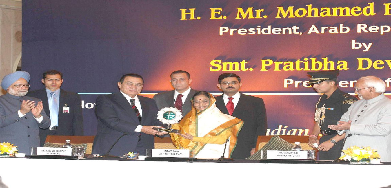 The President of India, Smt Pratibha Devisingh Patil presenting the Jawaharlal Nehru Award for International Understanding to the President of the Arab Republic of Egypt, HE Mr Mohamed Hosny Mubarak at ITC Maurya Hotel in New Delhi on Nov 18, 2008
