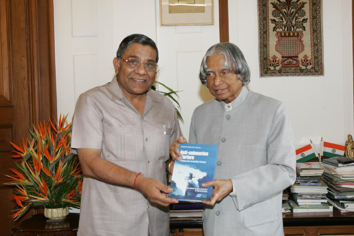 The President of India, Dr A P J Abdul Kalam with Dr R K Tewari, Professor, Dept of Electronics & Communications Engineering, Maharaaj Surajmal Institute of Technology to present the Book "Anti-Susmarine Warfare : Fighting the Invisible Enemy" at Rashtrapati Bhavan in New Delhi on May 22, 2006