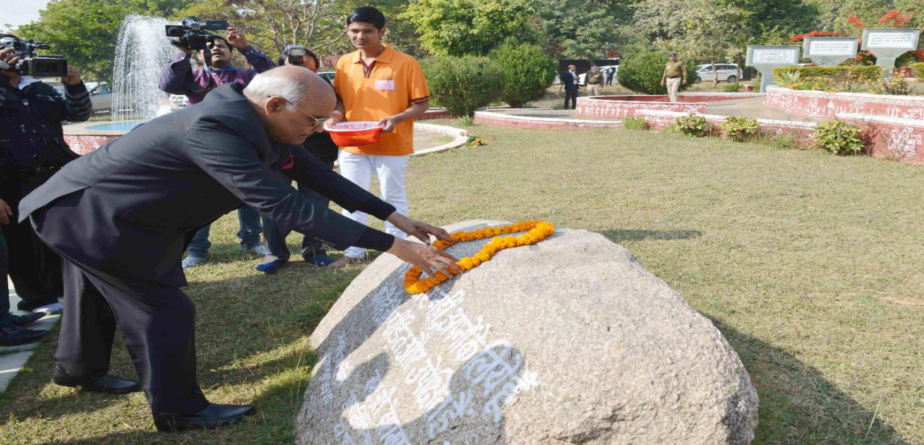 The President of India, Shri Ram Nath Kovind paying floral tributes at the bust of Mahatma Gandhi during the foundation stone laying ceremony for "Naya-Gram" Project of High Court of Allahabad, in Uttar Pradesh on December 16, 2017.