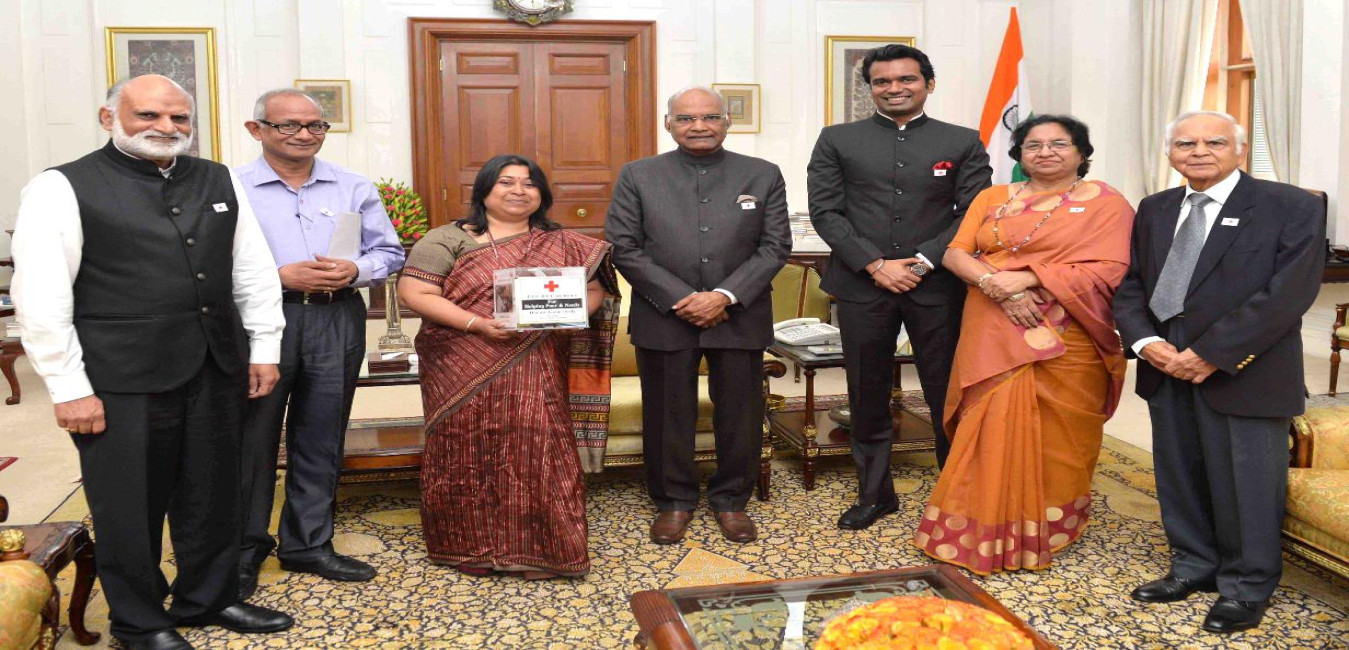 Shri Abhishek Singh, Secretary along with the members from Indian Red Cross Society meeting with the President of India, Shri Ram Nath Kovind to pin a flag on the occasion of Red Cross Flag Week, at Rashtrapati Bhavan on November 02, 2017.