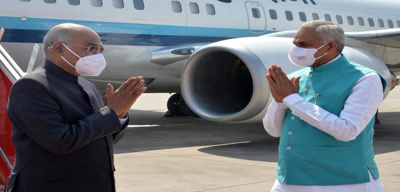 The President of India, Shri Ram Nath Kovind being received by the Governor of Gujarat, Shri Acharya Devvrat and the Deputy Chief Minister of Gujarat, Shri Nitin Patel, on his arrival, in Ahmedabad on February 23, 2021.